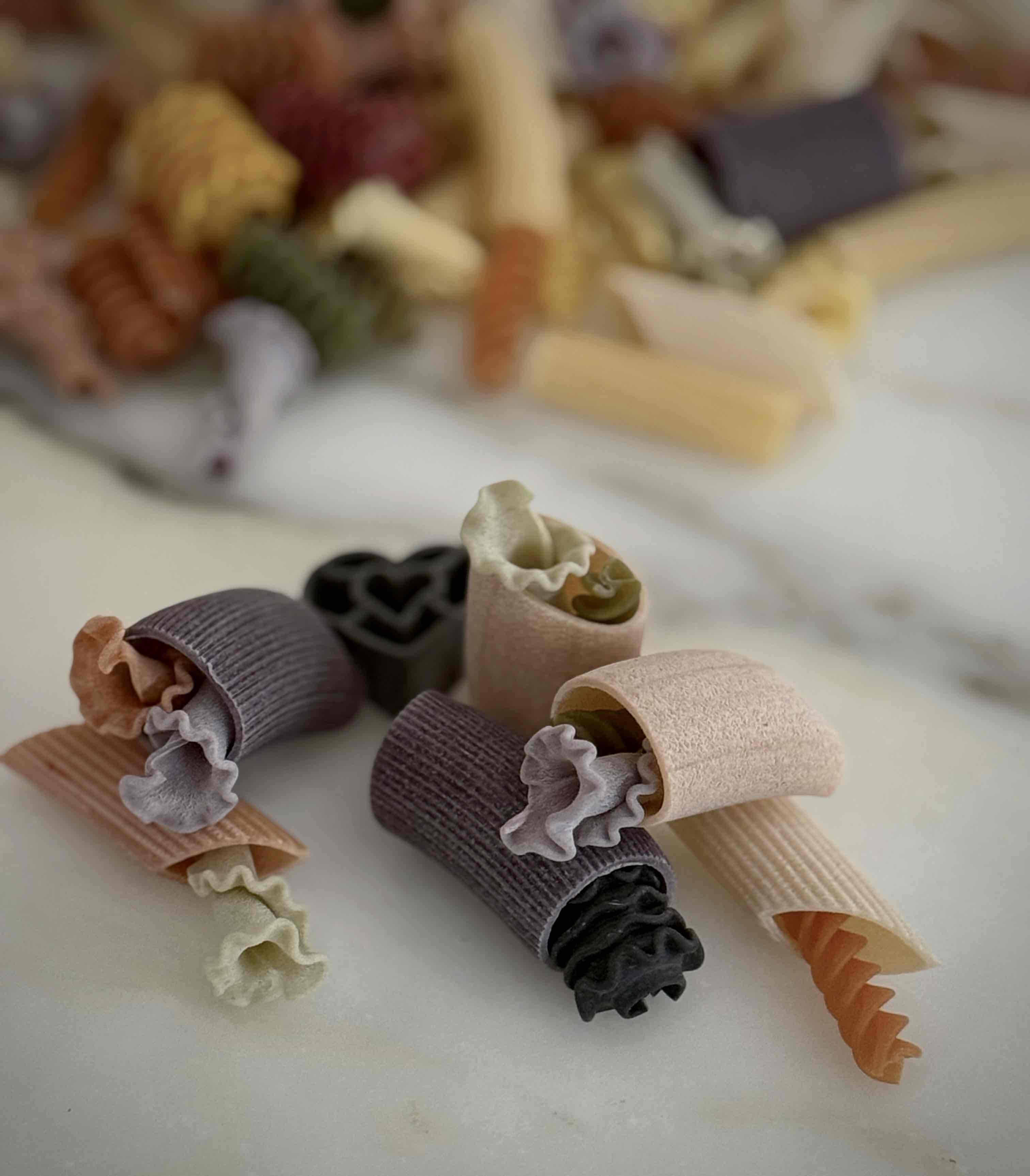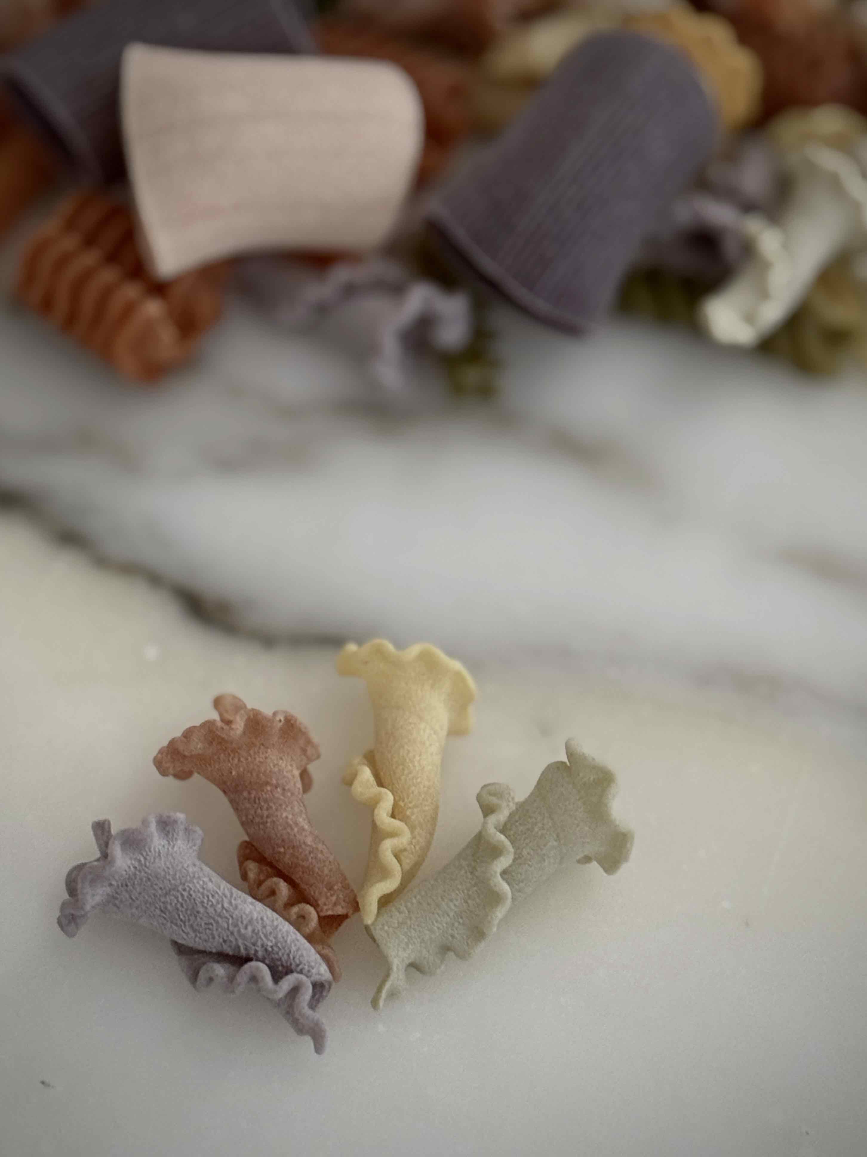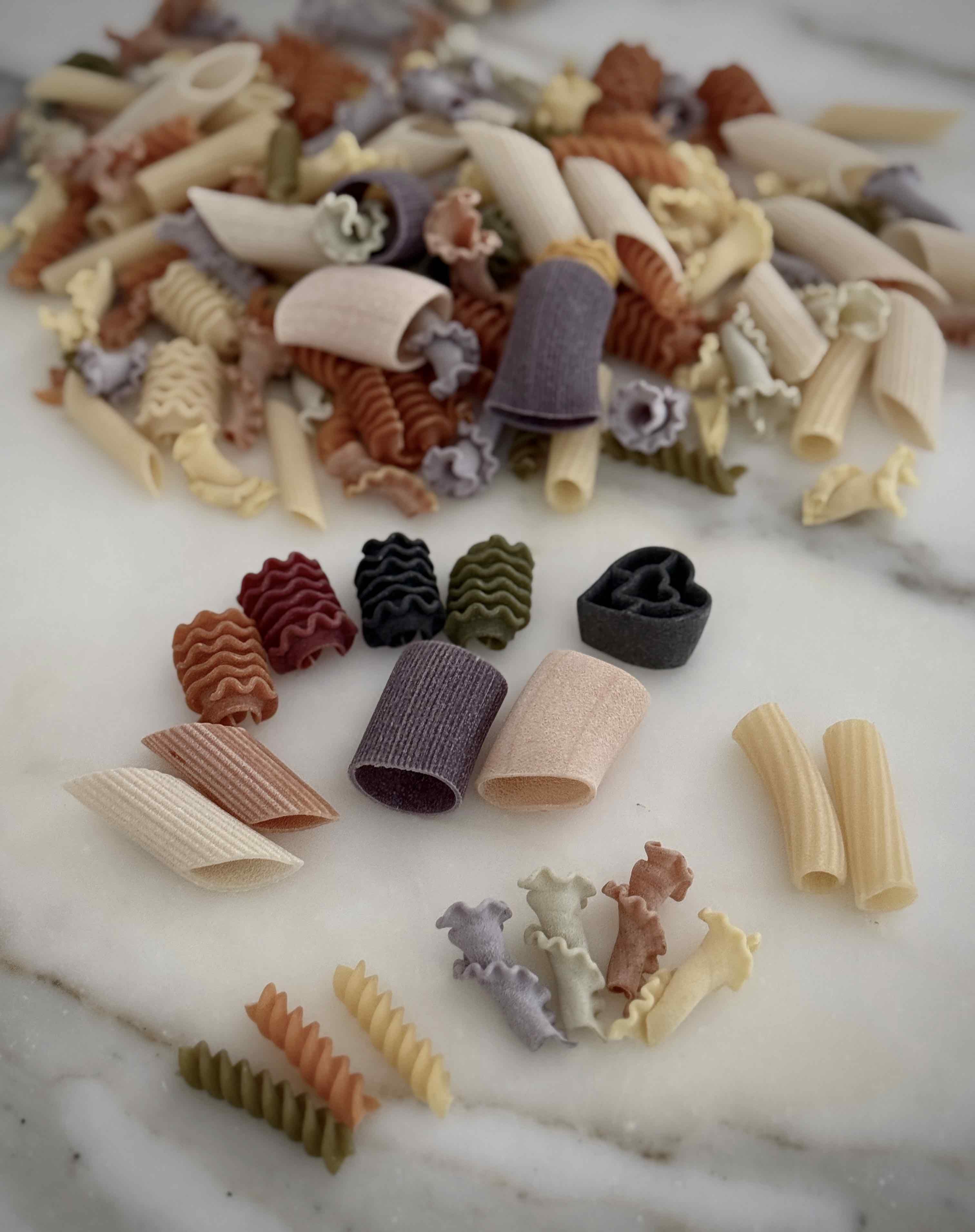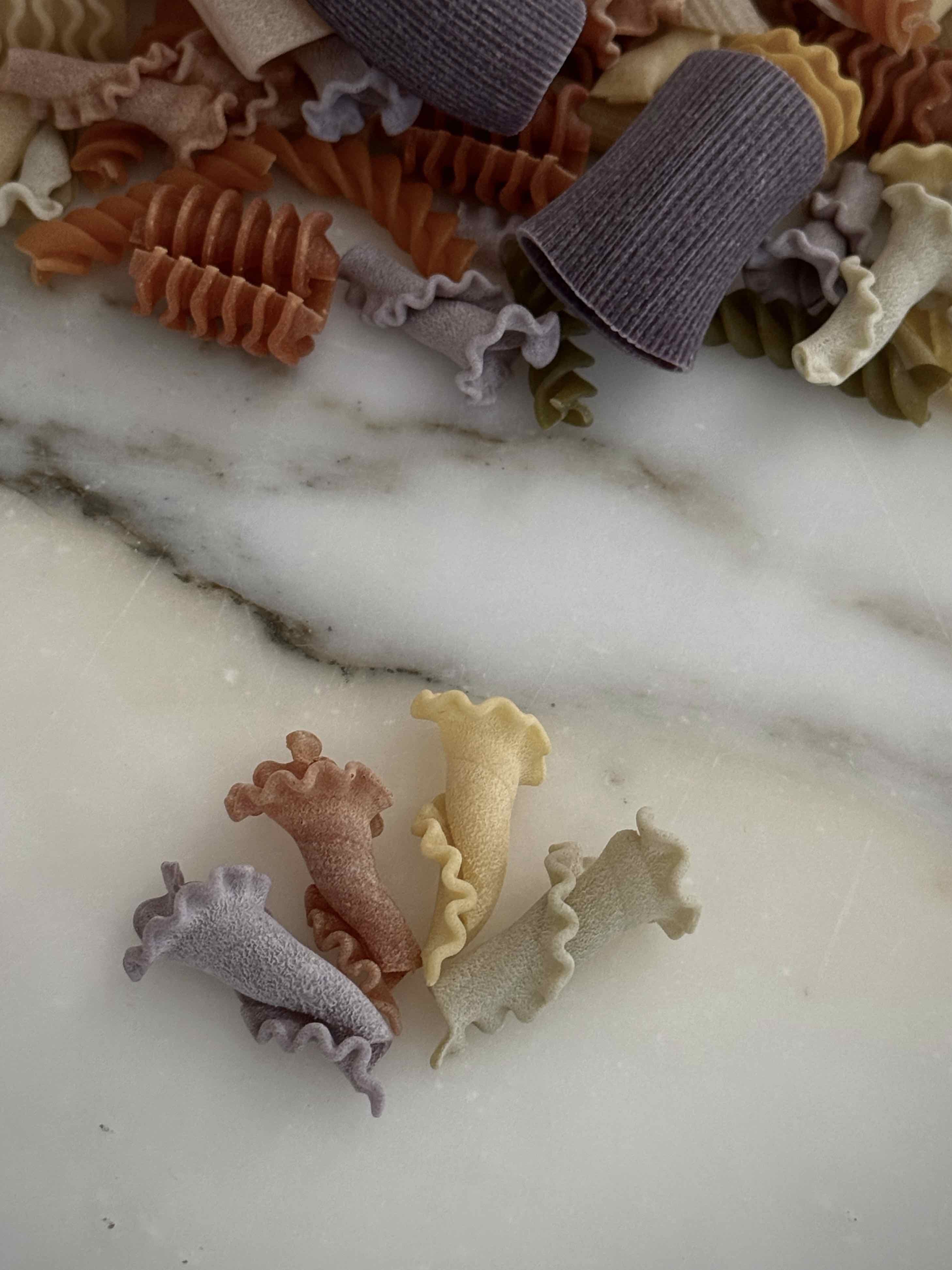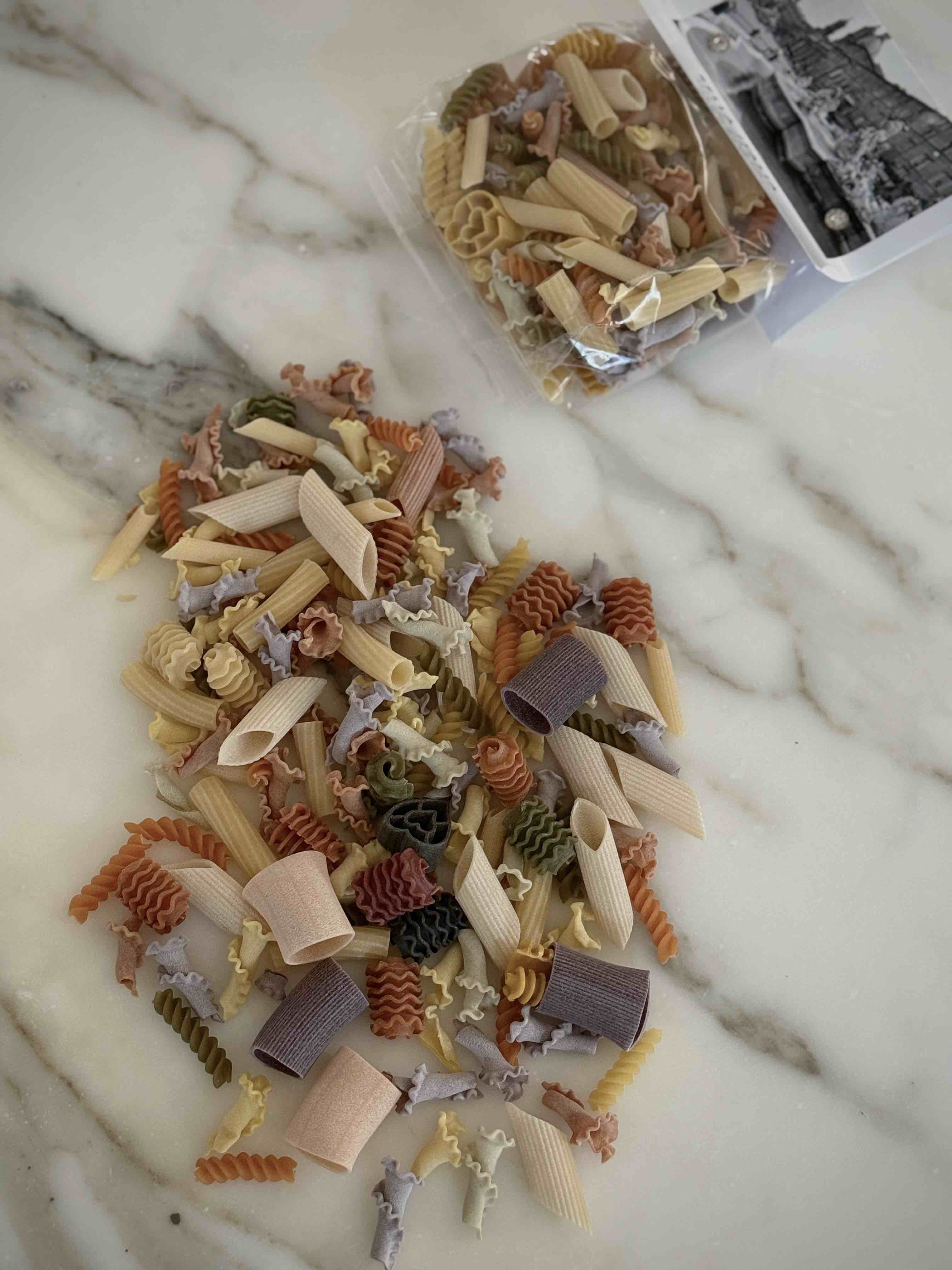 成分:硬質小麥粗麵粉、辣椒、紅甜菜、菠菜、薑黃、黑墨魚汁、番茄、羅勒、胡蘿蔔