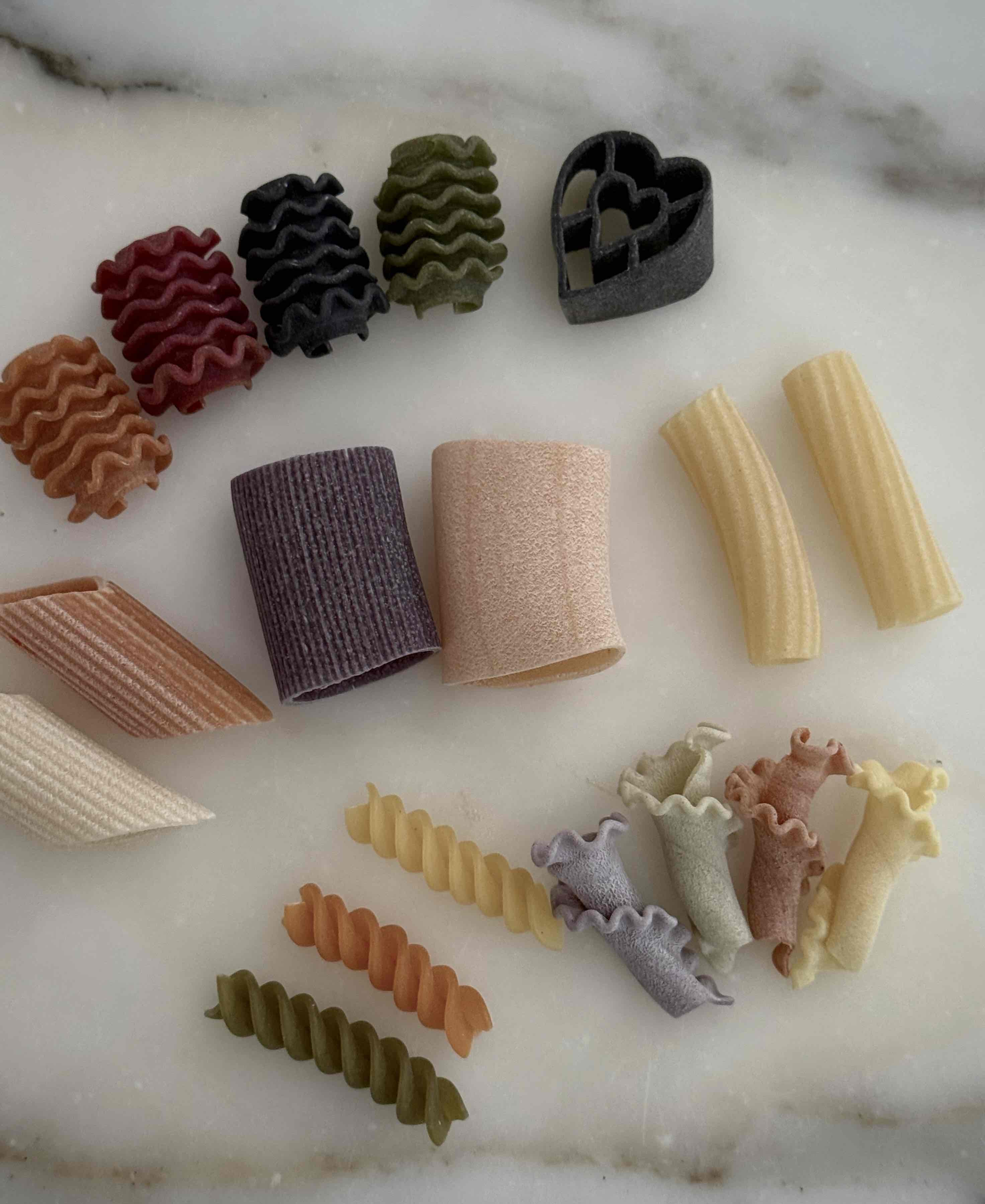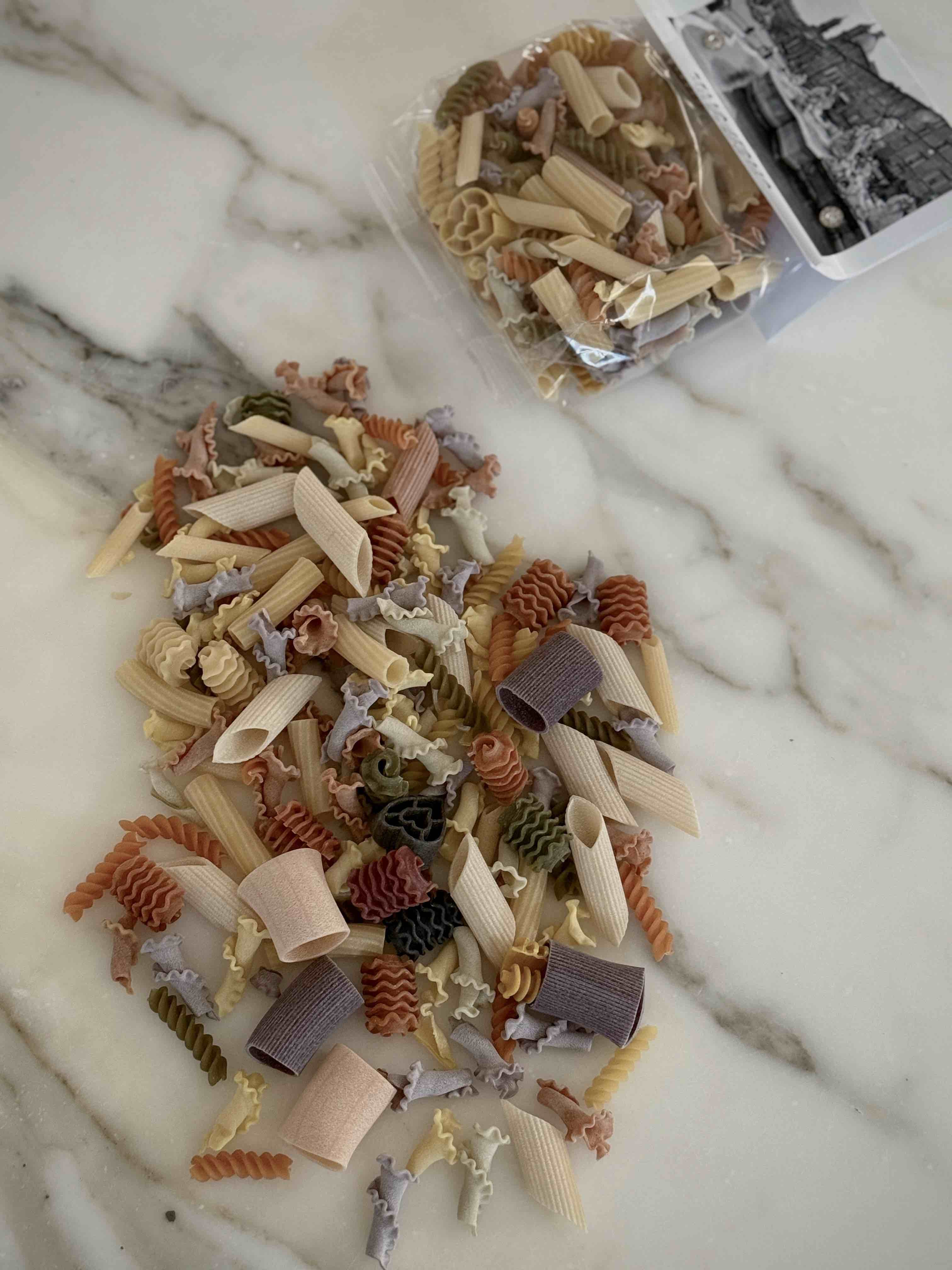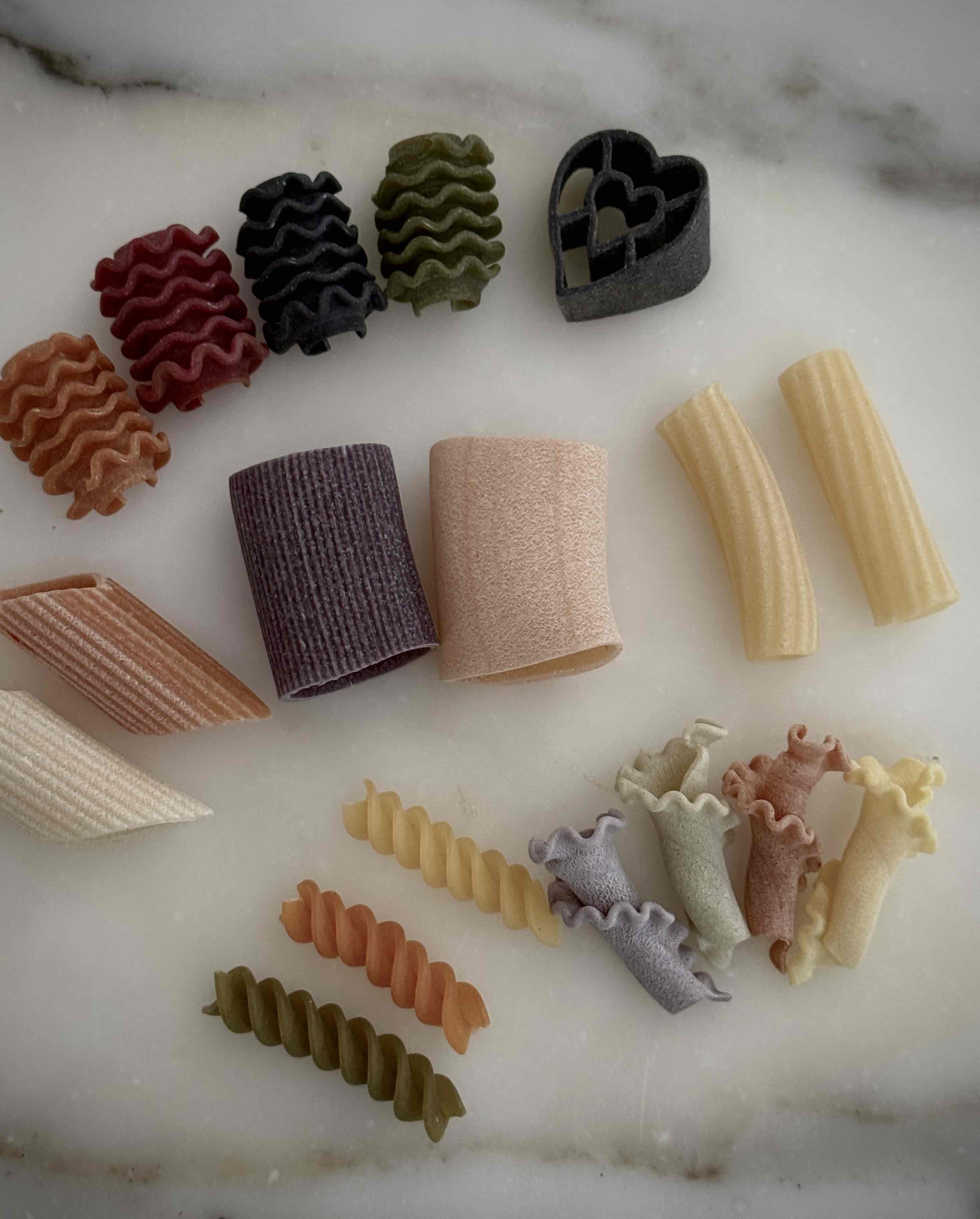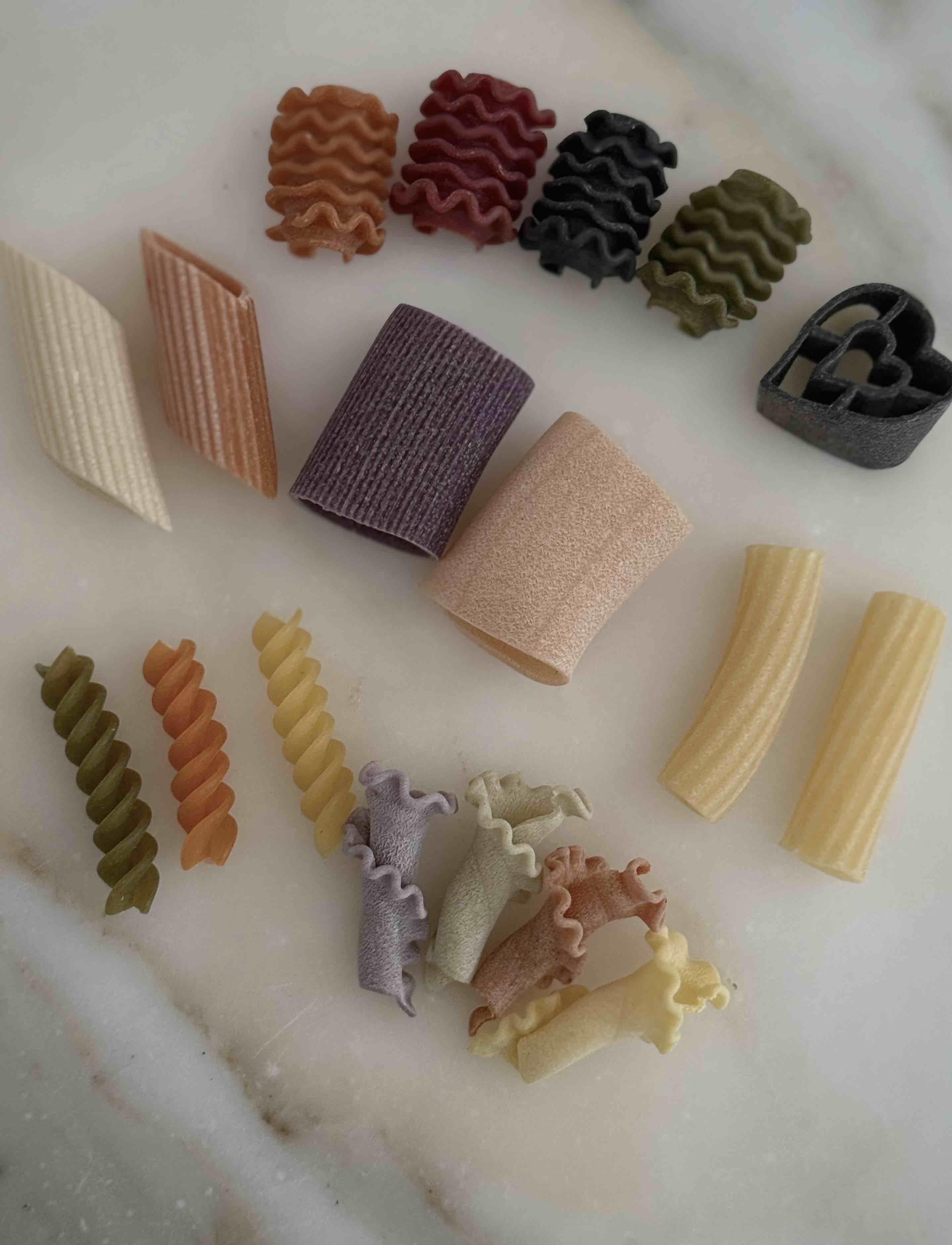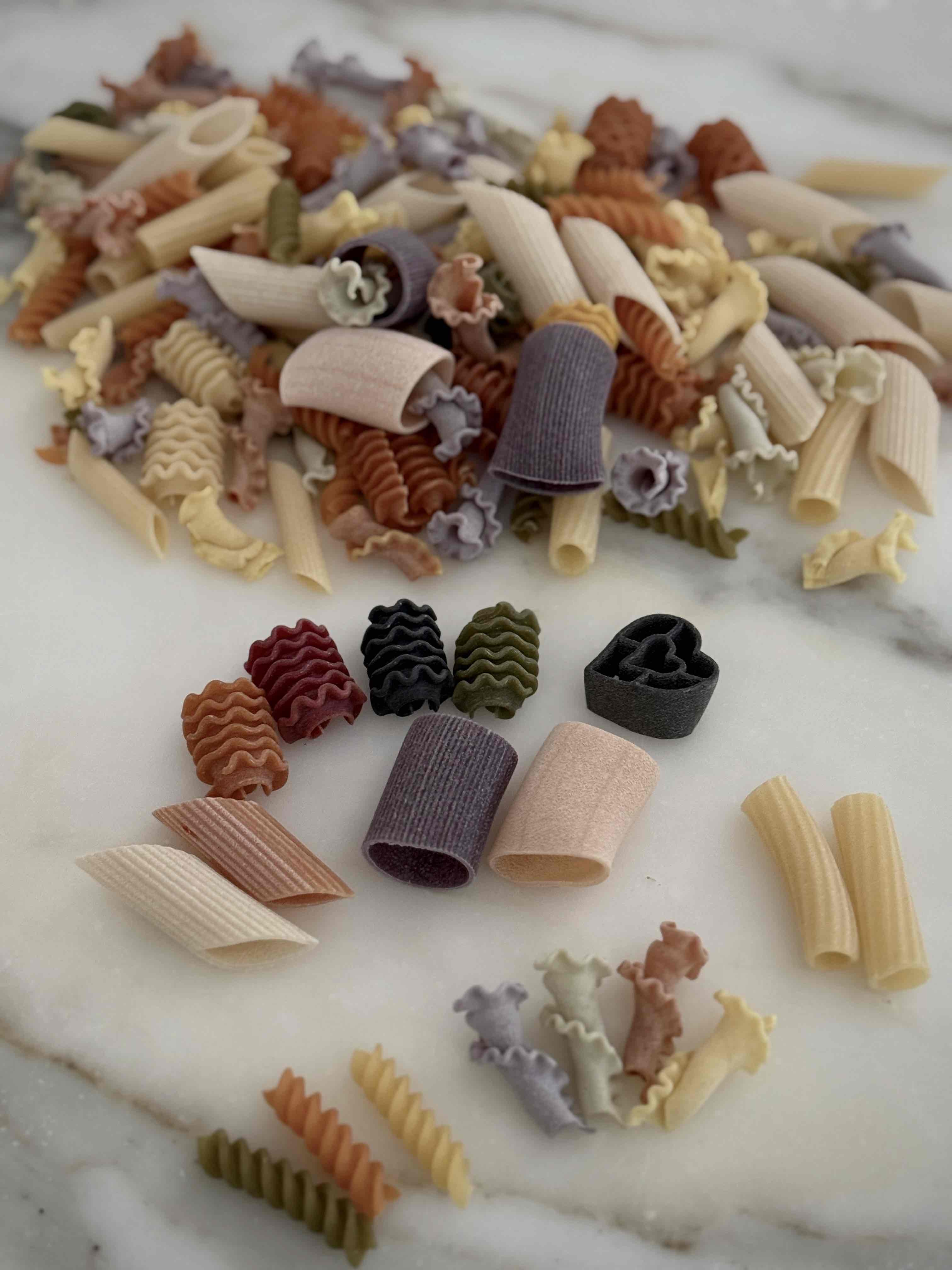 成分:硬質小麥粗麵粉、辣椒、紅甜菜、菠菜、薑黃、黑墨魚汁、番茄、羅勒、胡蘿蔔