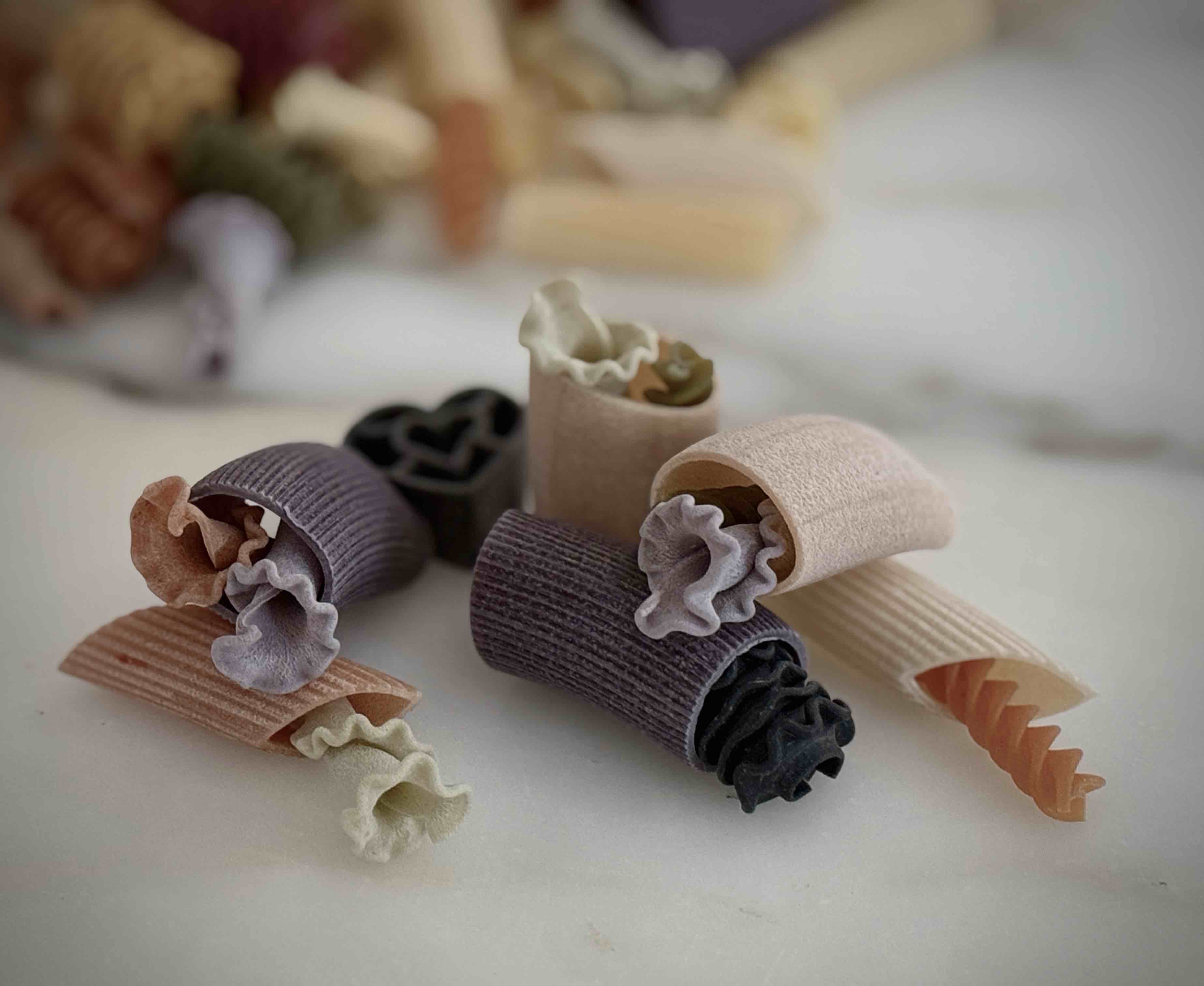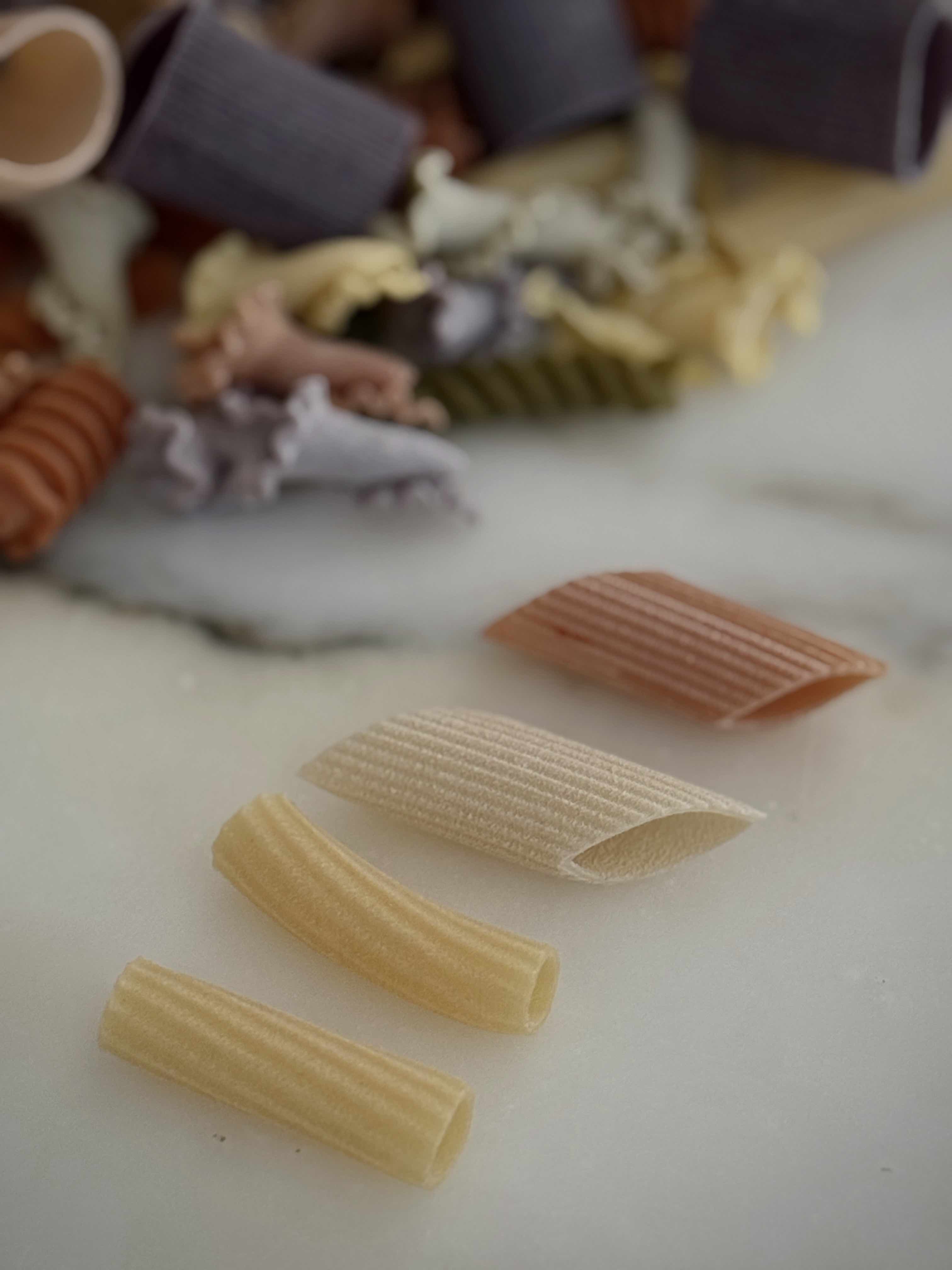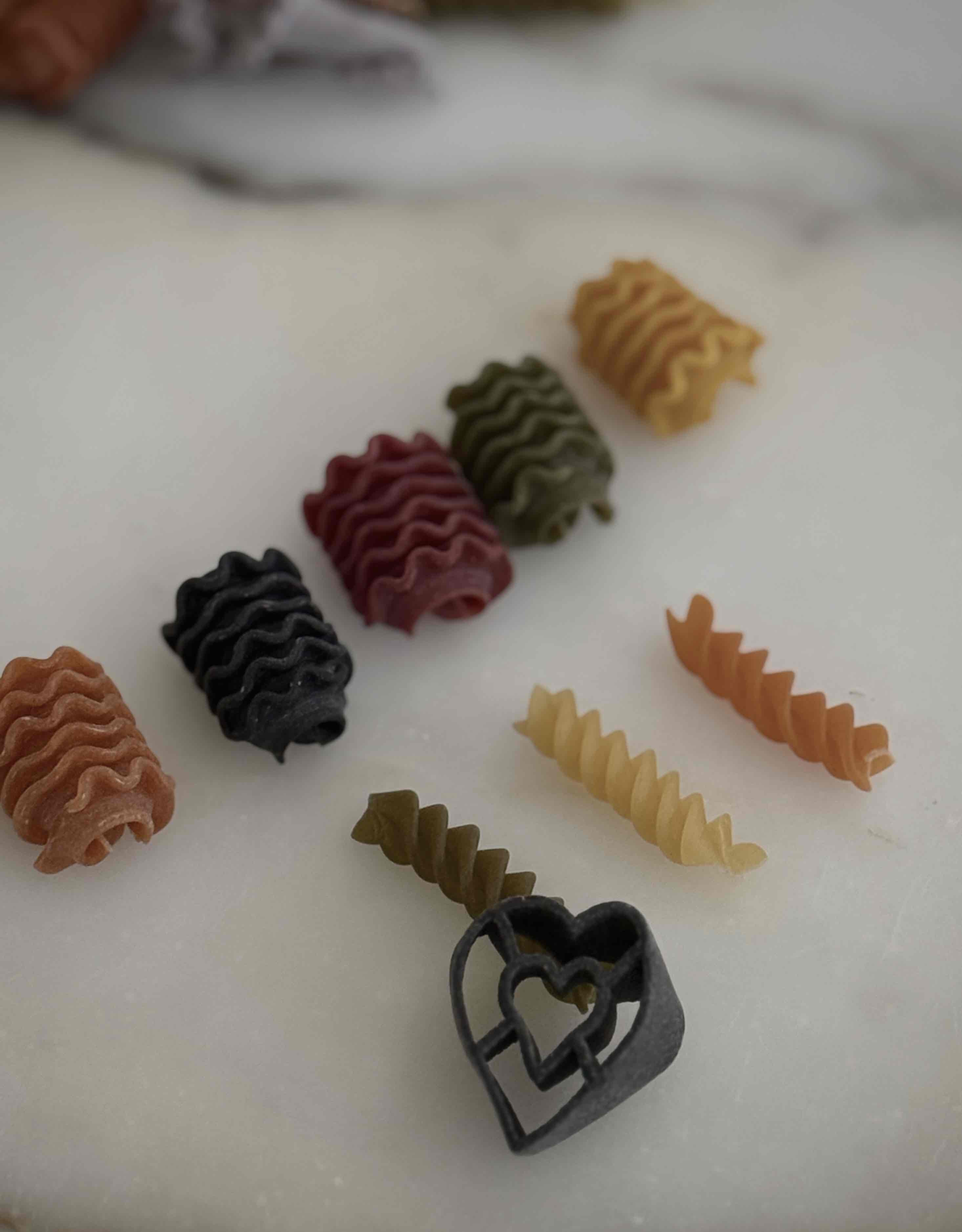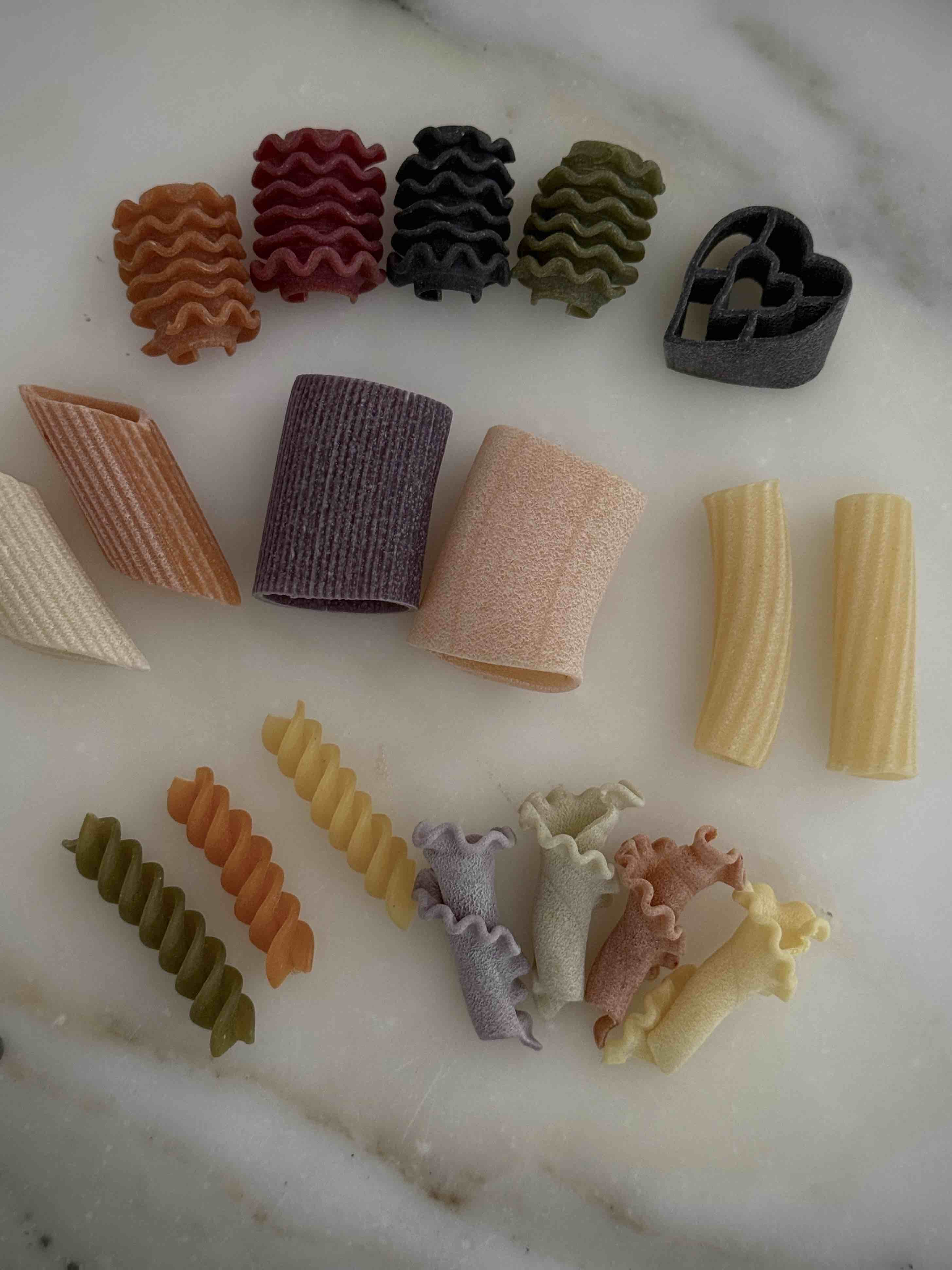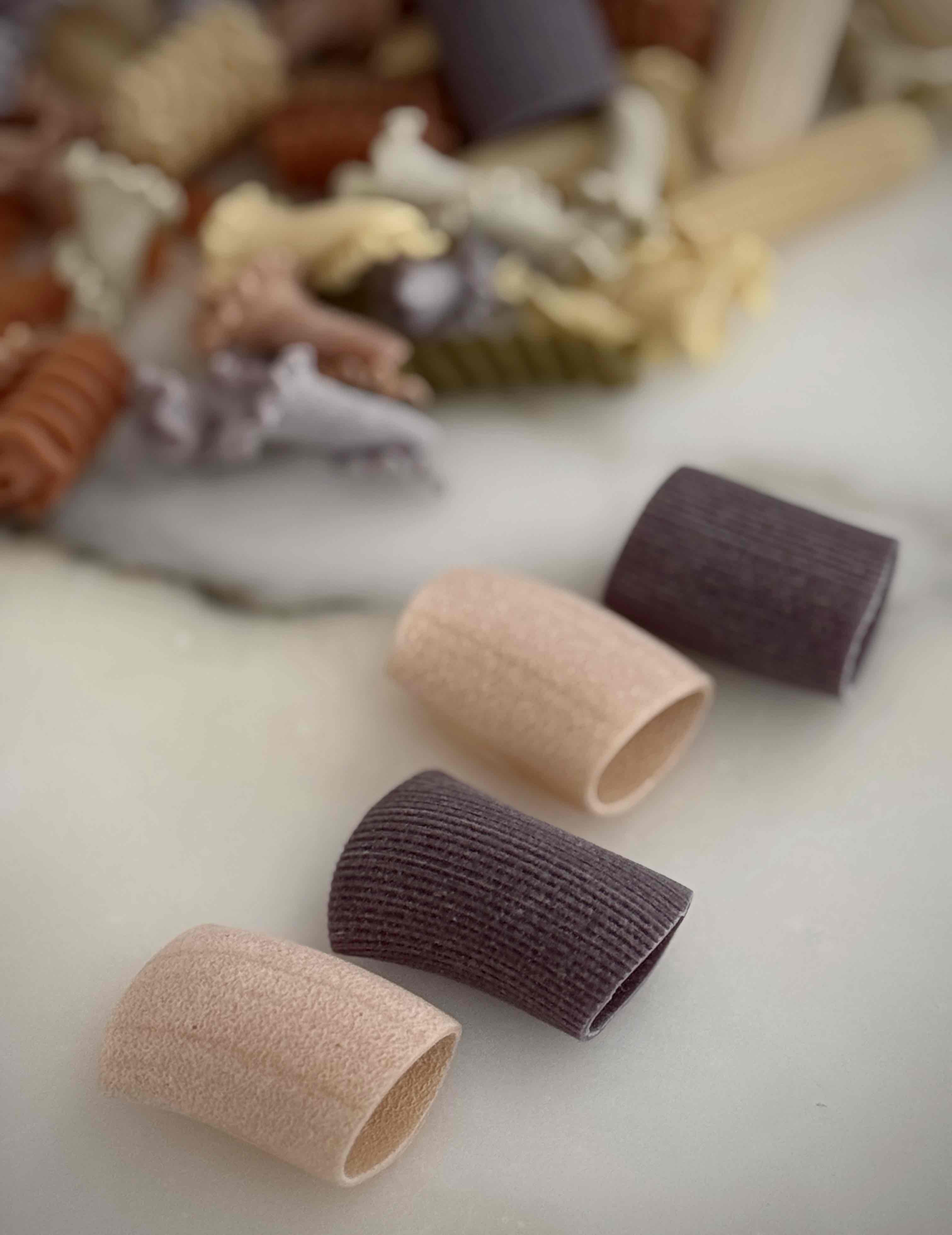 成分:硬質小麥粗麵粉、辣椒、紅甜菜、菠菜、薑黃、黑墨魚汁、番茄、羅勒、胡蘿蔔